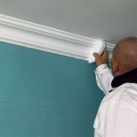 Zum Abschluß müssen die Fugen zwischen der Stuckleiste und der Decke sowie die Fugen zwischen der Wand und der Stuckleiste geschlossen werden. Dies geht einfach, indem etwas Kleber mit Hilfe der Kartuschenpresse auf die Fugen aufgebracht wird. Der Kleber lässt sich mit einem nassen Schwamm oder der angefeuchteten Fingerspitze glätten und verteilen. Wenn alle Stuckarbeiten abgeschlossen sind, brauchen Sie den Styroporstuck nur noch mit einer umweltfreundlichen Farbe auf Wasserbasis (sogenannter Dispersionsfarbe) zu streichen. Dadurch erhalten die Zierleisten und die Stöße ein einheitliches Aussehen und Ihr Stuck aus Styropor wirkt wie aus einem Guss.
