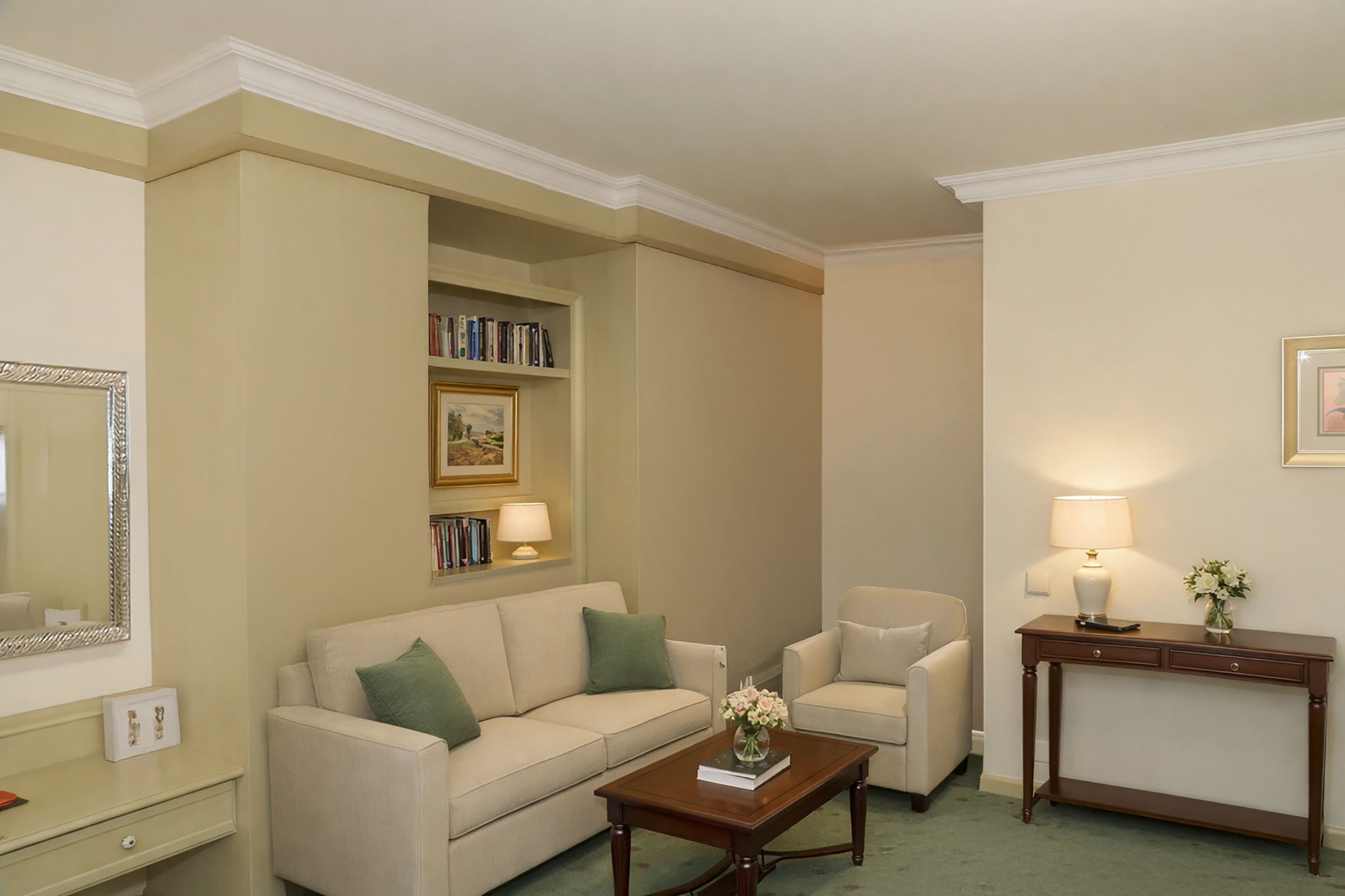 Durch die Verwendung gleich gemusterter, aber unterschiedlich dimensionierter Hohlkehlleisten kann jeder Raum proportional dekoriert werden, während im gesamten Wohnbereich eine einheitliche und harmonische Stuckgestaltung entsteht.