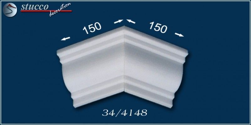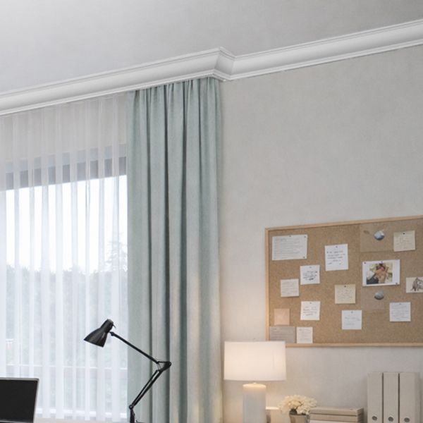 Vorgefertigtes 90°-Außeneckelement, welches das Verbergen der Gardinenschiene erleichtert. Mithilfe des äußeren Eckelements kann die Stuckverzierung als Abdeckung vor der Gardinenschiene weitergeführt werden.