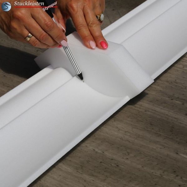 Wir müssen jetzt den überschüssigen Kleber entfernen, der aus den Stoßfugen zwischen den einzelnen Stuckleisten aus Styropor herausgekommen ist. Hierzu verwenden wir entweder einen Spachtel oder noch einfacher ist die Verwendung unserer Negativform, die wir für jede Stuckleiste anbieten.