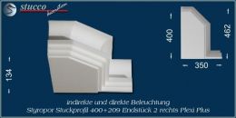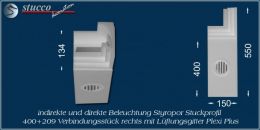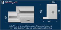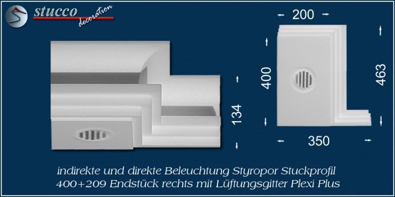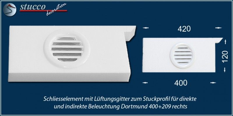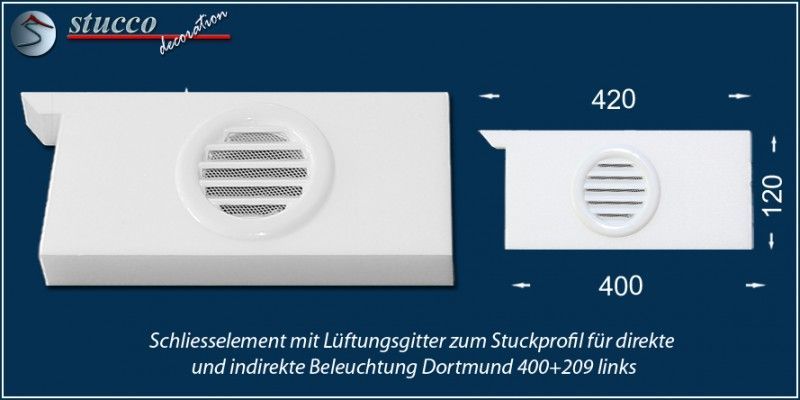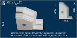 Endstück rechts bzw. links - mit und ohne Lüftungsgitter: Mit den Endstücken können Sie auch in der Wandmitte die L-förmige Lichtleiste Dortmund 400+209 Plexi Plus zeitsparend und professionell in die Stuckleiste für indirekte Beleuchtung Dortmund 209 Plexi Plus übergehen lassen. Die Endstücke sorgen gleichzeitig für einen gediegenen Abschluss der L-förmigen Styroporleiste.