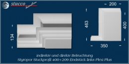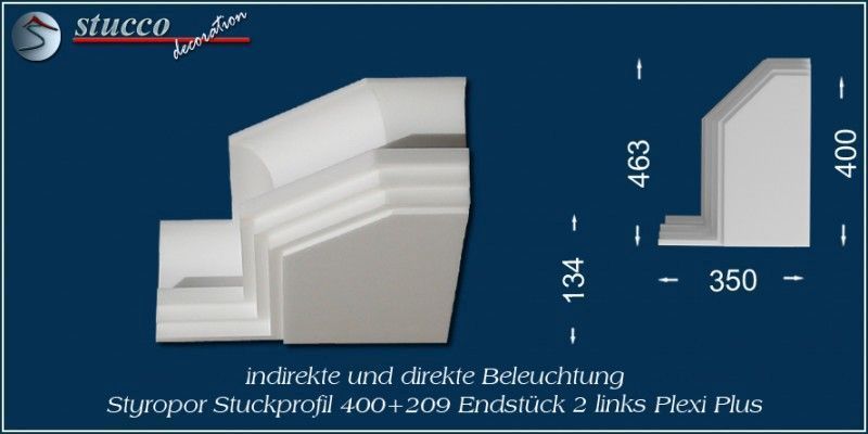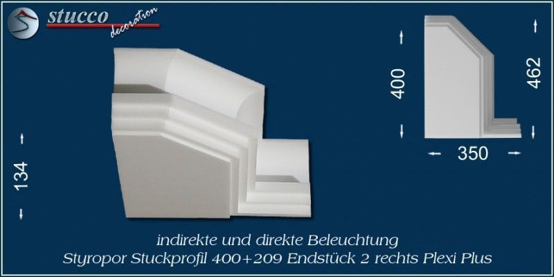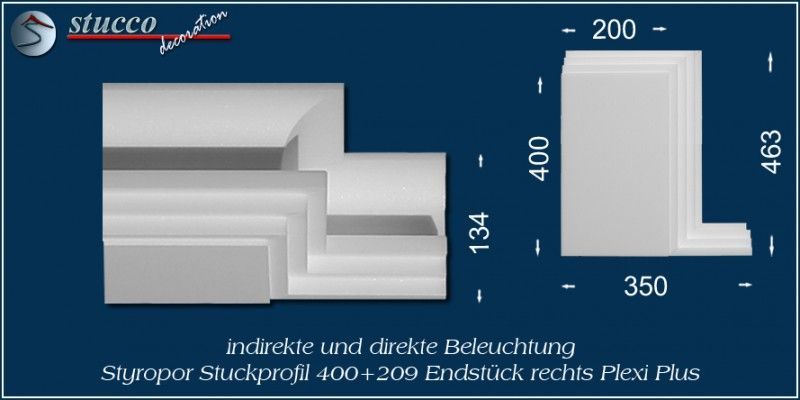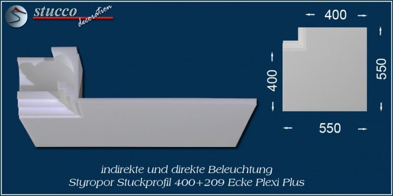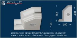 Die Kombi Lichtleisten für direkte und indirekte Beleuchtung Dortmund 400+209 Plexi Plus sind Stuckprofile aus Styropor, die sich aus der Stuckleiste für indirekte Beleuchtung Dortmund 209 Plexi Plus und einer 400 mm breiten Grundfläche zusammensetzen. Mit Hilfe von 3 Fixierungsstücken pro Meter (je eins am Anfang, in der Mitte und am Ende) lässt sich dieses Stuckprofil leicht und aufwandsarm einbauen. Eckelemente, Verbindungsstücke und Endstücke ermöglichen eine ganz individuelle Gestaltung der Deckenbeleuchtung, die Sie speziell an Ihre räumlichen Gegebenheiten anpassen können. Die Kombi Lichtleiste Dortmund 400+209 Plexi Plus ist in der Größe und im Muster auf die Stuckleiste Dortmund 209 Plexi Plus für indirekte Beleuchtung abgestimmt, so dass Sie beide Leistenarten auch abwechslungsreich miteinander kombinieren können.
