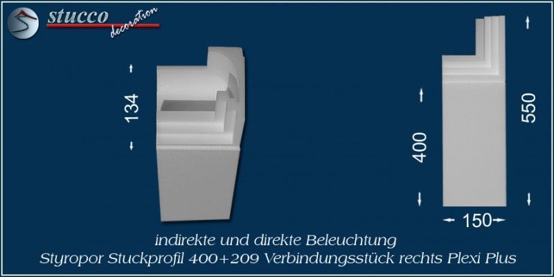Verbindungsstück rechts bzw. links - mit und ohne Lüftungsgitter: Die Verbindungsstücke bieten Ihnen die Möglichkeit, in den Zimmerecken unkompliziert und schnell den Übergang von der L-förmigen Kombi Lichtleiste Dortmund 400+209 Plexi Plus zur Stuckleiste für indirekte Beleuchtung München Dortmund 209 Plexi Plus zu schaffen. Sie brauchen beim Auswählen der Verbindungsstücke nur darauf zu achten, auf welcher Seite der Kombi Leiste Sie die Leiste für nur indirekte Beleuchtung anschließen möchten.
