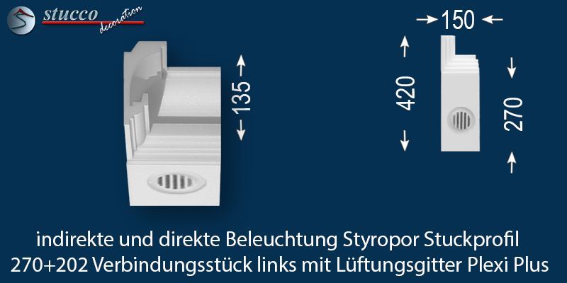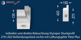 Verbindungsstück rechts bzw. links - mit und ohne Lüftungsgitter: Die Verbindungsstücke bieten Ihnen die Möglichkeit, in den Zimmerecken unkompliziert und schnell den Übergang von der L-förmigen Kombi Lichtleiste Essen 270+202 Plexi Plus zur Stuckleiste für indirekte Beleuchtung Essen 202 Plexi Plus zu schaffen. Sie brauchen beim Auswählen der Verbindungsstücke nur darauf zu achten, auf welcher Seite der Kombi Leiste Sie die Leiste für nur indirekte Beleuchtung anschließen möchten.