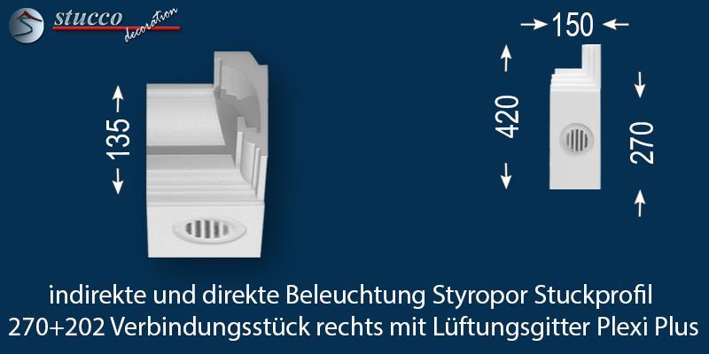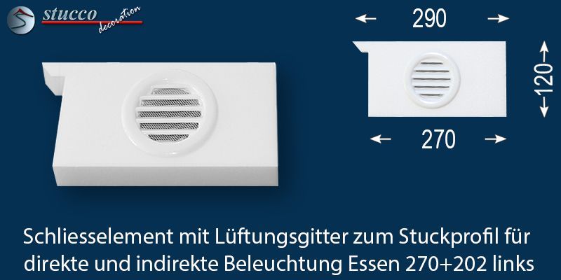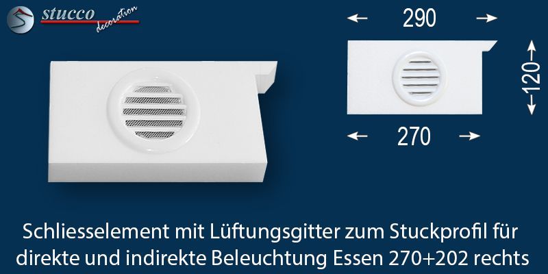 Endstück rechts bzw. links - mit und ohne Lüftungsgitter: Mit den Endstücken können Sie auch in der Wandmitte die L-förmige Lichtleiste Essen 270+202 Plexi Plus zeitsparend und professionell in die Stuckleiste für indirekte Beleuchtung Essen 202 Plexi Plus übergehen lassen. Die Endstücke sorgen gleichzeitig für einen gediegenen Abschluss der L-förmigen Styroporleiste.
