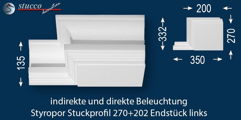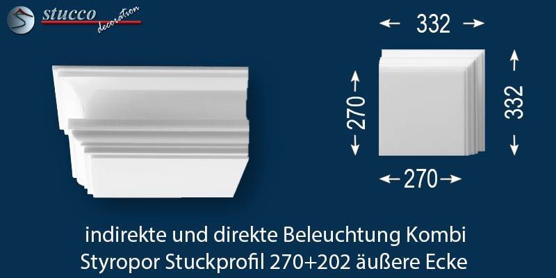 Die Stuckprofil für direkte und indirekte Beleuchtung Essen 270+202 sind Stuckprofile aus Styropor, die sich aus der Stuckleiste für indirekte Beleuchtung Essen 202 und einer 270 mm breiten Grundfläche zusammensetzen. Mit Hilfe von 3 Fixierungsstücken pro Meter (je eins am Anfang, in der Mitte und am Ende) lässt sich dieses Stuckprofil leicht und aufwandsarm einbauen. Eckelemente, Verbindungsstücke und Endstücke ermöglichen eine ganz individuelle Gestaltung der Deckenbeleuchtung, die Sie speziell an Ihre räumlichen Gegebenheiten anpassen können. Die Kombi Lichtleiste Essen 270+202 ist in der Größe und im Muster auf die Stuckleiste Essen 202 für indirekte Beleuchtung abgestimmt, so dass Sie beide Leistenarten auch abwechslungsreich miteinander kombinieren können.
