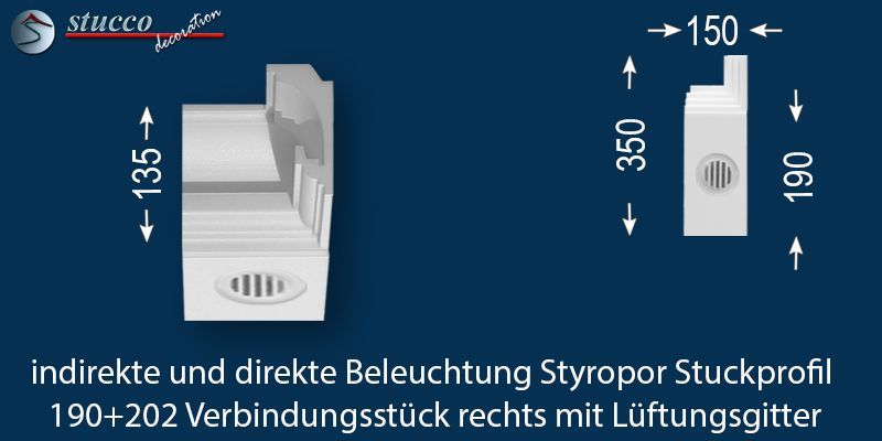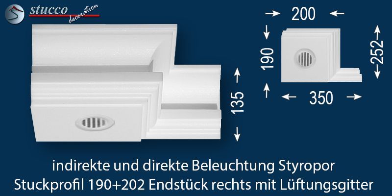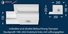 Endstück rechts bzw. links - mit und ohne Lüftungsgitter: Mit den Endstücken können Sie auch in der Wandmitte die L-förmige Lichtleiste Essen 190+202 zeitsparend und professionell in die Stuckleiste für indirekte Beleuchtung Essen 202 übergehen lassen. Die Endstücke sorgen gleichzeitig für einen gediegenen Abschluss der L-förmigen Styroporleiste.