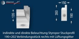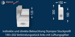 Verbindungsstück rechts bzw. links - mit und ohne Lüftungsgitter: Die Verbindungsstücke bieten Ihnen die Möglichkeit, in den Zimmerecken unkompliziert und schnell den Übergang von der L-förmigen Kombi Lichtleiste Essen 190+202 zur Stuckleiste für indirekte Beleuchtung Essen 202 zu schaffen. Sie brauchen beim Auswählen der Verbindungsstücke nur darauf zu achten, auf welcher Seite der Kombi Leiste Sie die Leiste für nur indirekte Beleuchtung anschließen möchten.