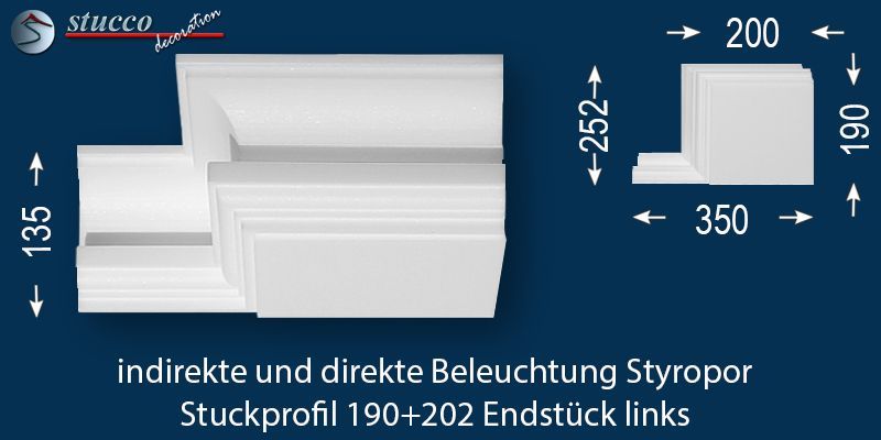 Am Seitenanfang haben Sie die Produkttabelle mit der Kombi Lichtleiste für direkte und indirekte Beleuchtung Essen 190+202 gesehen. In dieser Tabelle finden Sie unter der Stuckleiste verschiedene Ergänzungselemente, die Ihnen die Umsetzung Ihrer Wohnidee erleichtern. Die oben angeführten Stuckelemente passen in Größe und Stuckprofil zu den Kombi Lichtleisten für direkte und indirekte Beleuchtung Essen 190+202: