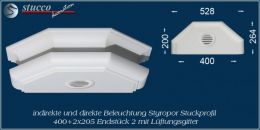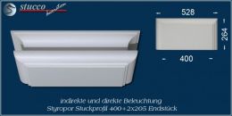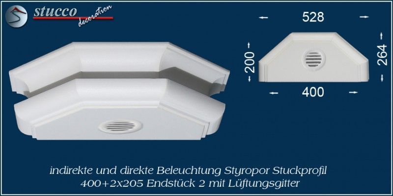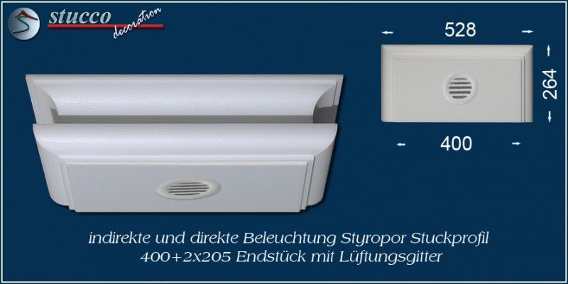 Endstück mit und ohne Lüftungsgitter: Mit den Endstücken können Sie die U-förmige Lichtleiste München 400+2x205 zeitsparend und professionell abschließen. Die Endstücke sorgen für einen gediegenen, formvollendeten Abschluss der U-förmigen Styroporleisten.