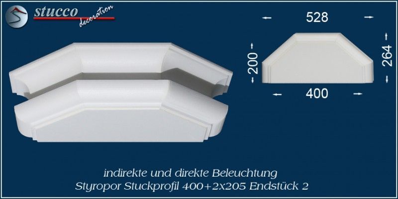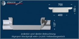 Die Stuckprofile für direkte und indirekte Deckenbeleuchtung München 400+2x205 sind Stuckprofile aus Styropor. Die U-förmigen Styroporprofile bestehen aus einer 400 mm breiten Grundfläche, an die sich beidseitig die Stuckleiste für indirekte Beleuchtung München 205 anschließt. Mit Hilfe von 3 Fixierungsstücken pro Meter (je eins am Anfang, in der Mitte und am Ende) lässt sich dieses Stuckprofil leicht und aufwandsarm einbauen. Verbindungsstücke und Endstücke ermöglichen eine individuelle Gestaltung der Deckenbeleuchtung, die Sie speziell an Ihre räumlichen Gegebenheiten anpassen können. Die Kombi Lichtleiste München 400+2x205 ist in der Größe und im Muster auf die Stuckleiste München 205 für indirekte Beleuchtung abgestimmt, so dass Sie beide Leistenarten auch abwechslungsreich miteinander kombinieren können.