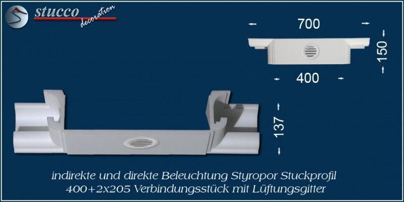 Verbindungsstück mit und ohne Lüftungsgitter: Die Verbindungsstücke bieten Ihnen die Möglichkeit, unkompliziert und schnell den Übergang von der L-förmigen Kombi Lichtleiste München 400+2x205 zur Stuckleiste für indirekte Beleuchtung München 205 zu schaffen.