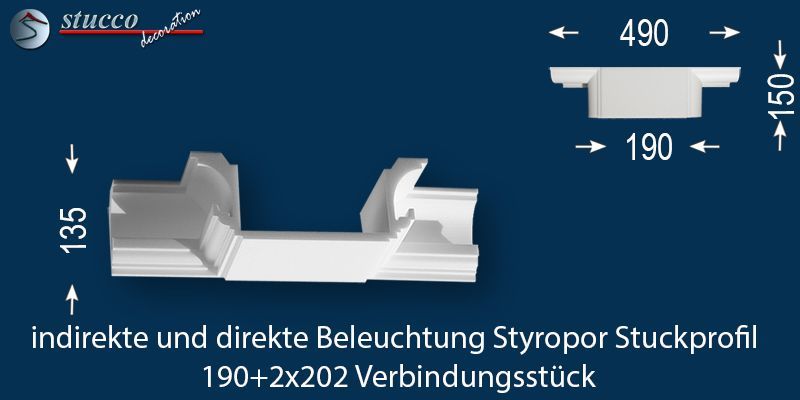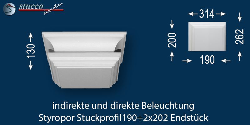 AAm Seitenanfang haben Sie die Produkttabelle mit der Kombi Lichtleiste für direkte und indirekte Beleuchtung Essen 190+2x202 gesehen. In dieser Tabelle finden Sie unter der Stuckleiste verschiedene Ergänzungselemente, die Ihnen die Umsetzung Ihrer Wohnidee erleichtern. Die oben angeführten Stuckelemente passen in Größe und Stuckprofil zu den Kombi Lichtleisten für direkte und indirekte Beleuchtung Essen 190+2x202: