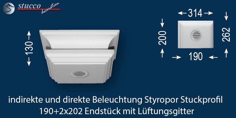 Endstück mit und ohne Lüftungsgitter: Mit den Endstücken können Sie die U-förmige Lichtleiste Essen 190+2x202 zeitsparend und professionell abschließen. Die Endstücke sorgen für einen gediegenen, formvollendeten Abschluss der U-förmigen Styroporleisten.