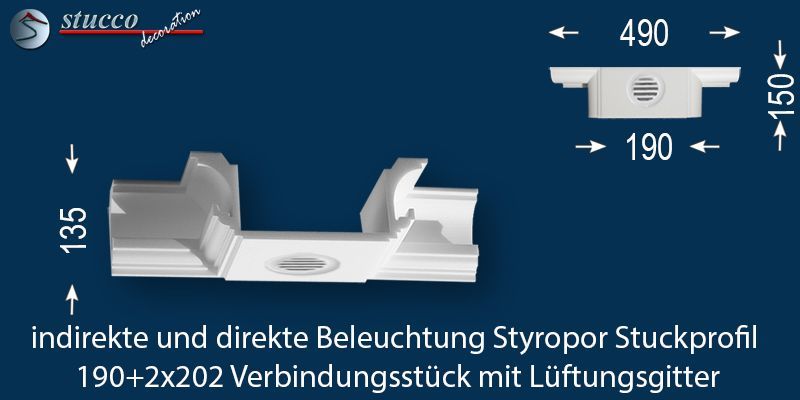 Verbindungsstück mit und ohne Lüftungsgitter: Die Verbindungsstücke bieten Ihnen die Möglichkeit, unkompliziert und schnell den Übergang von der L-förmigen Kombi Lichtleiste Essen 190+2x202 zur Stuckleiste für indirekte Beleuchtung Essen 202 zu schaffen.
