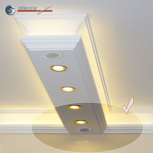 Direkte und indirekte Beleuchtung LED lässt sich platzsparend in einer Styroporleiste miteinander kombinieren. Verwenden Sie dafür einfach Kombi Stuckleisten für direkte und indirekte Beleuchtung. In die Grundfläche der Kombi Lichtleiste werden LED Einbauspots montiert, die für angenehmes, direktes Licht sorgen. In die seitliche Zierleiste wird ein LED Strip eingebaut, der behagliches, indirektes Licht spendet. Die L-förmige Styroporleiste bietet Ihnen außerdem die Möglichkeit, den Trafo und den Dimmer der indirekten Beleuchtung darin unterzubringen.