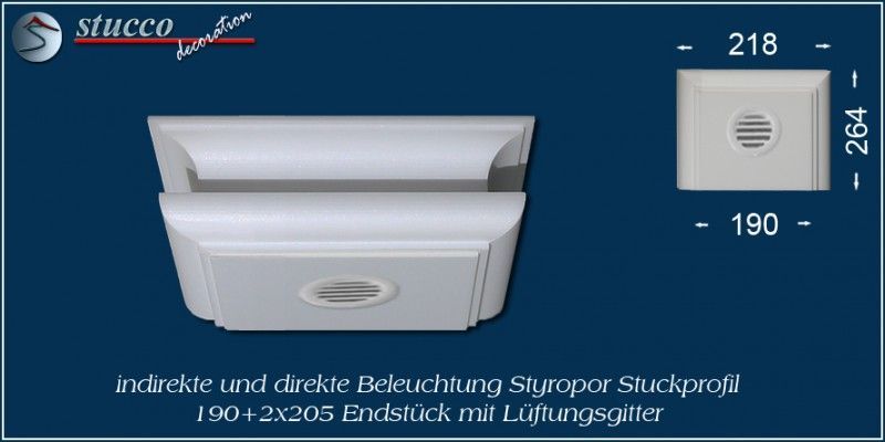 Endstück mit und ohne Lüftungsgitter: Mit den Endstücken können Sie die U-förmige Lichtleiste München 190+2x205 zeitsparend und professionell abschließen. Die Endstücke sorgen für einen gediegenen, formvollendeten Abschluss der U-förmigen Styroporleisten.