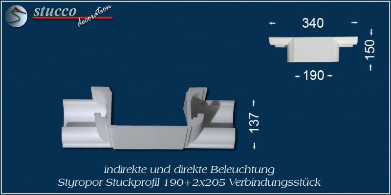 Die Stuckprofile für direkte und indirekte Deckenbeleuchtung München 190+2x205 sind Stuckprofile aus Styropor. Die U-förmigen Styroporprofile bestehen aus einer 190 mm breiten Grundfläche, an die sich beidseitig die Stuckleiste für indirekte Beleuchtung München 205 anschließt. Mit Hilfe von 3 Fixierungsstücken pro Meter (je eins am Anfang, in der Mitte und am Ende) lässt sich dieses Stuckprofil leicht und aufwandsarm einbauen. Verbindungsstücke und Endstücke ermöglichen eine individuelle Gestaltung der Deckenbeleuchtung, die Sie speziell an Ihre räumlichen Gegebenheiten anpassen können. Die Kombi Lichtleiste München 190+2x205 ist in der Größe und im Muster auf die Stuckleiste München 205 für indirekte Beleuchtung abgestimmt, so dass Sie beide Leistenarten auch abwechslungsreich miteinander kombinieren können.