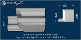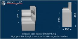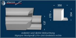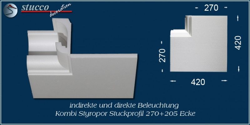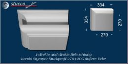 Die Kombi Lichtleisten für direkte und indirekte Beleuchtung München 270+205 sind Stuckprofile aus Styropor, die sich aus der Stuckleiste für indirekte Beleuchtung München 205 und einer 270 mm breiten Grundfläche zusammensetzen. Mit Hilfe von 3 Fixierungsstücken pro Meter (je eins am Anfang, in der Mitte und am Ende) lässt sich dieses Stuckprofil leicht und aufwandsarm einbauen. Eckelemente, Verbindungsstücke und Endstücke ermöglichen eine ganz individuelle Gestaltung der Deckenbeleuchtung, die Sie speziell an Ihre räumlichen Gegebenheiten anpassen können. Die Kombi Lichtleiste München 270+205 ist in der Größe und im Muster auf die Stuckleiste München 205 für indirekte Beleuchtung abgestimmt, so dass Sie beide Leistenarten auch abwechslungsreich miteinander kombinieren können.