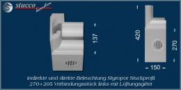 Endstück rechts bzw. links - mit und ohne Lüftungsgitter: Mit den Endstücken können Sie auch in der Wandmitte die L-förmige Lichtleiste München 270+205 zeitsparend und professionell in die Stuckleiste für indirekte Beleuchtung München 205 übergehen lassen. Die Endstücke sorgen gleichzeitig für einen gediegenen Abschluss der L-förmigen Styroporleiste.