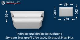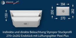 Endstück mit und ohne Lüftungsgitter: Mit den Endstücken können Sie die U-förmige Lichtleiste Essen 270+2x202 Plexi Plus zeitsparend und professionell abschließen. Die Endstücke sorgen für einen gediegenen, formvollendeten Abschluss der U-förmigen Styroporleisten.