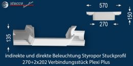 Verbindungsstück mit und ohne Lüftungsgitter: Die Verbindungsstücke bieten Ihnen die Möglichkeit, unkompliziert und schnell den Übergang von der L-förmigen Kombi Lichtleiste Essen 270+2x202 Plexi Plus zur Stuckleiste für indirekte Beleuchtung Essen 202 Plexi Plus zu schaffen.