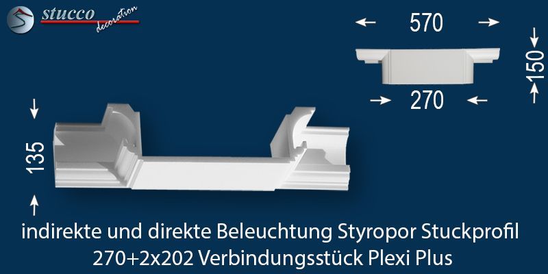 AAm Seitenanfang haben Sie die Produkttabelle mit der Kombi Lichtleiste für direkte und indirekte Beleuchtung Essen 270+2x202 Plexi Plus gesehen. In dieser Tabelle finden Sie unter der Stuckleiste verschiedene Ergänzungselemente, die Ihnen die Umsetzung Ihrer Wohnidee erleichtern. Die oben angeführten Stuckelemente passen in Größe und Stuckprofil zu den Kombi Lichtleisten für direkte und indirekte Beleuchtung Essen 270+2x202 Plexi Plus: