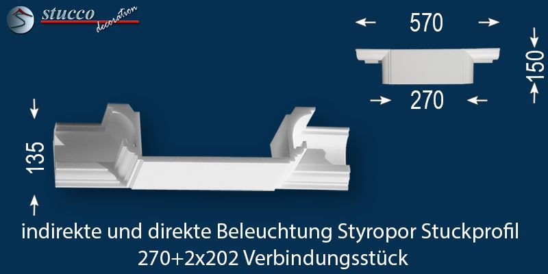 AAm Seitenanfang haben Sie die Produkttabelle mit der Kombi Lichtleiste für direkte und indirekte Beleuchtung Essen 270+2x202 gesehen. In dieser Tabelle finden Sie unter der Stuckleiste verschiedene Ergänzungselemente, die Ihnen die Umsetzung Ihrer Wohnidee erleichtern. Die oben angeführten Stuckelemente passen in Größe und Stuckprofil zu den Kombi Lichtleisten für direkte und indirekte Beleuchtung Essen 270+2x202: