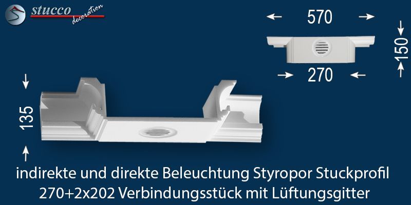 Verbindungsstück mit und ohne Lüftungsgitter: Die Verbindungsstücke bieten Ihnen die Möglichkeit, unkompliziert und schnell den Übergang von der L-förmigen Kombi Lichtleiste Essen 270+2x202 zur Stuckleiste für indirekte Beleuchtung Essen 202 zu schaffen.