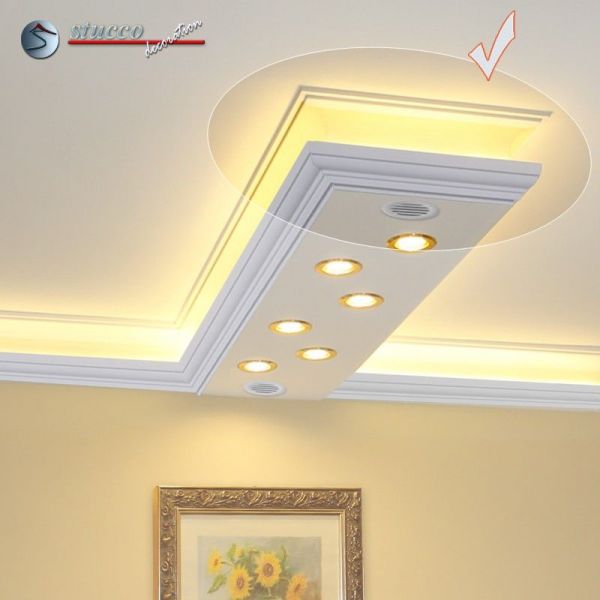 Direkte und indirekte Beleuchtung LED lässt sich platzsparend in einer Styroporleiste miteinander kombinieren. Verwenden Sie dafür einfach Kombi Stuckleisten für direkte und indirekte Beleuchtung. In die Grundfläche der Kombi Lichtleiste werden LED Einbauspots montiert, die für angenehmes, direktes Licht sorgen. In die seitliche Zierleiste wird ein LED Strip eingebaut, der behagliches, indirektes Licht spendet. Die L-förmige Styroporleiste bietet Ihnen außerdem die Möglichkeit, den Trafo und den Dimmer der indirekten Beleuchtung darin unterzubringen.
