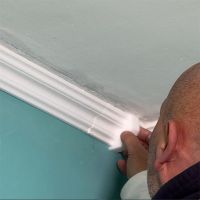 Zum Abschluß müssen die Fugen zwischen der Stuckleiste und der Decke sowie die Fugen zwischen der Wand und der Stuckleiste geschlossen werden. Dies geht einfach, indem etwas Kleber mit Hilfe der Kartuschenpresse auf die Fugen aufgebracht wird. Der Kleber lässt sich mit einem nassen Schwamm oder der angefeuchteten Fingerspitze glätten und verteilen. Wenn alle Stuckarbeiten abgeschlossen sind, brauchen Sie den Styroporstuck nur noch mit einer umweltfreundlichen Farbe auf Wasserbasis (sogenannter Dispersionsfarbe) zu streichen. Dadurch erhalten die Zierleisten und die Stöße ein einheitliches Aussehen und Ihr Stuck aus Styropor wirkt wie aus einem Guss.