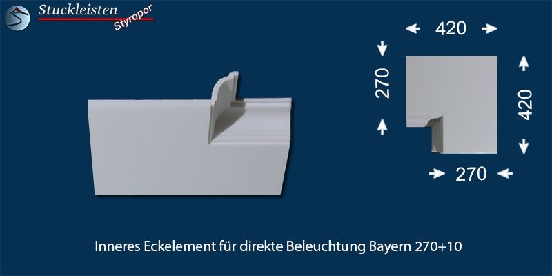 Das Stuckprofil Bayern 270+10 ist eine Stuckleiste aus Polystyrol Hartschaum (XPS), welche speziell für den Einbau von LED Spots entwickelt wurde. Die Gesamtbreite des Profils beträgt 320 mm, für den Einbau der LED Spots bietet die Grundplatte eine Breite von 270 mm. Das Stuckprofil ist 73 mm hoch und kann nahtlos mit der klasssichen Stuckleiste Bayern 10 verbunden werden.