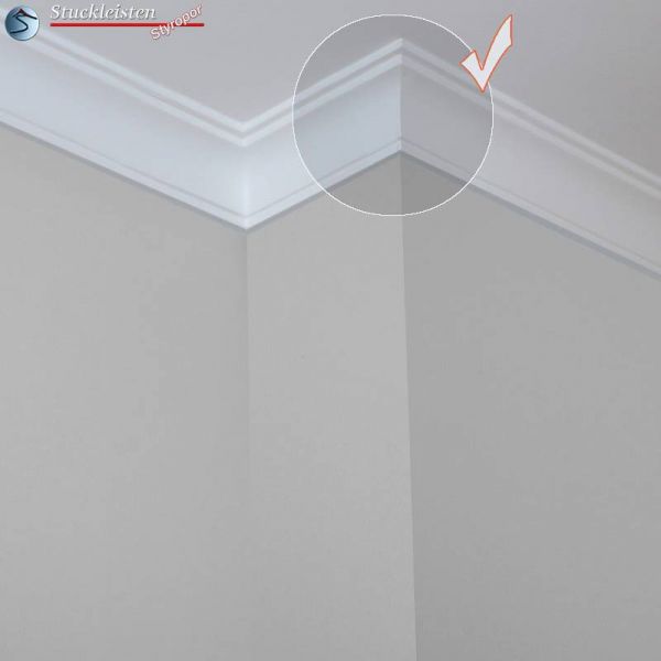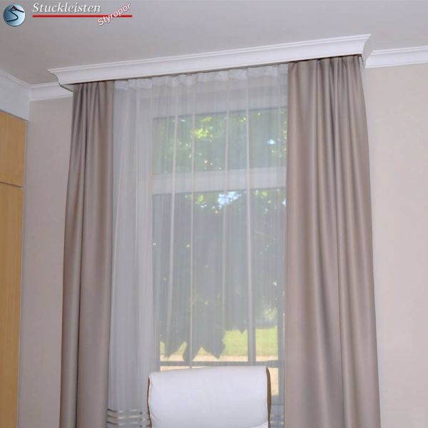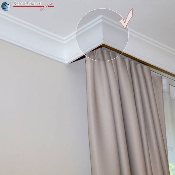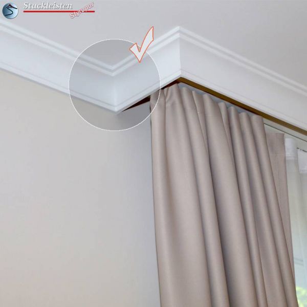 Bei der Innenraumgestaltung werden meistens alle Wände eines Raumes mit der gleichen Stuckleiste verziert. Die Stuckleiste wird in die Hohlkehle zwischen Wand und Decke geklebt, hat also zwei Klebeflächen: eine an der Wand, die andere an der Decke. Doch wie soll man verfahren, wenn man eine Gardinenstange mit der Stuckleiste verkleiden möchte? Bei den Fenstern steht meist nur die Klebefläche an der Decke zur Verfügung. Aus diesem Grund bieten wir passend zur Stuckleiste Bayern 10 die Vorhangleiste Bayern 10 an. Die Vorhangleiste zur Stuckleiste Bayern 10 verfügt über eine breitere obere Klebefläche. So kann die Profilleiste trotz nur einer zur Verfügung stehenden Klebefläche stabil fixiert werden. Natürlich sind Innen- und Außenecken auch zur Vorhangleiste als vorgefertigte Stuckelemente erhältlich.