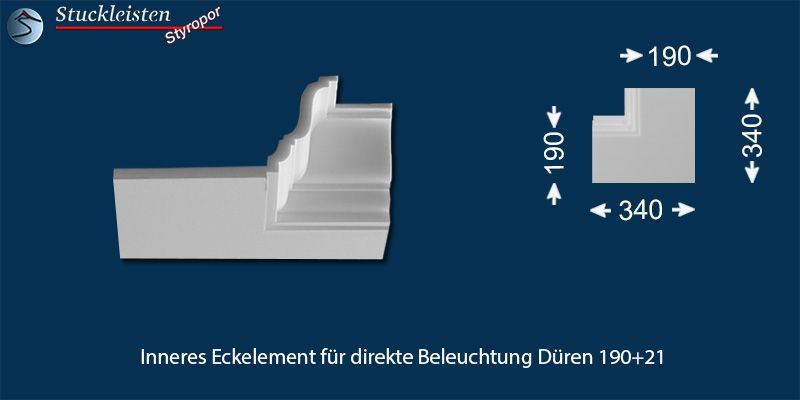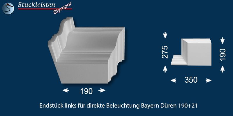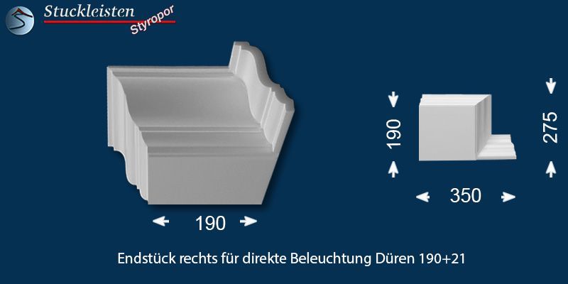 Das Stuckprofil Düren 190+21 ist eine Stuckleiste aus Polystyrol Hartschaum (XPS), welche speziell für den Einbau von LED Spots entwickelt wurde. Die Gesamtbreite des Profils beträgt 275 mm, für den Einbau der LED Spots bietet die Grundplatte eine Breite von 190 mm. Das Stuckprofil ist 125 mm hoch und kann nahtlos mit der klassischen Stuckleiste Düren 21 verbunden werden.