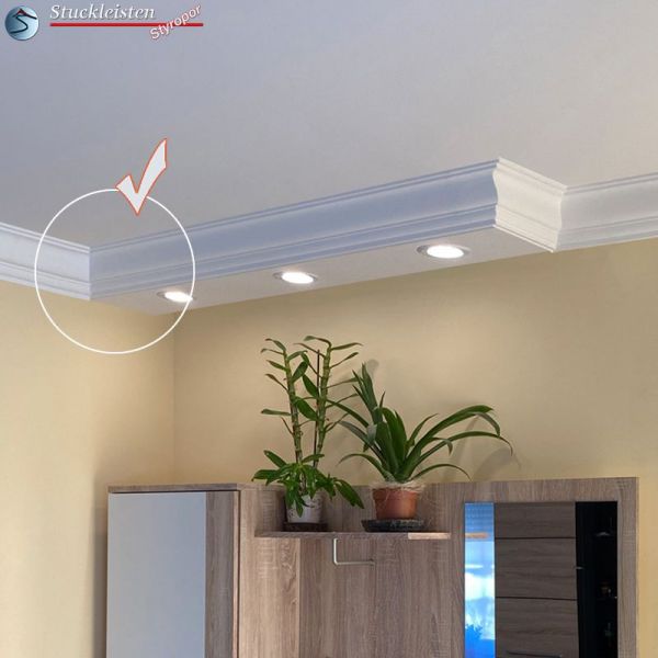 Das L-förmige Stuckprofil Düren 190+21 besteht aus einer 19 cm breiten Grundplatte, an die auf einer Längsseite die Zierleiste Düren 21 angefügt ist. So entsteht die L-Form, die für den Übergang von der Wand zur Decke ist. In die Grundplatte können Sie einreihig LED Spotlampen mit Einbaurahmen oder LED Panels Ihrer Wahl einbauen. Die Styroporleisten können mit Farben auf Wasserbasis gestrichen werden.