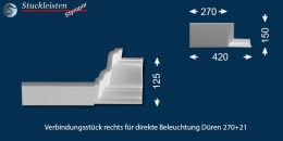 Rechtes und linkes Verbindungsstück: Falls eine Wandseite im Raum mit der klassischen Deckenleiste Düren 21 und die anschließende Wandseite mit dem Stuckprofil für direkte Beleuchtung Düren 270+21 verziert wird, dann sind die Verbindungsstücke ideal, um die beiden Stuckleisten in den Zimmerecken miteinander zu verbinden. An den einen Schenkel des Verbindungsstücks lässt sich die Zierleiste Düren 21 anfügen, an den anderen Schenkel das Stuckprofil Düren 270+21.