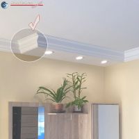 Das Stuckprofil Düren 270+2x21 ist ein U-Profil, das den Ausbau der direkten Deckenbeleuchtung mit LED Spots ermöglicht. Die Grundplatte des Profils ist 270 mm breit. Die Grundplatte verziert an beiden Längsseiten das Zierprofil Düren 21. Dieses Stuckprofil bietet eine schöne und praktische Möglichkeit für die Beleuchtung eines Esstisches oder einer Frühstückstheke in der Küche. In dem folgenden Video sehen Sie den Ausbau der Deckenbeleuchtung mit dem Stuckprofil Trier 400+2x14 und LED Spots. Der Einbau des Stuckprofils Düren 270+2x21 erfolgt genauso.