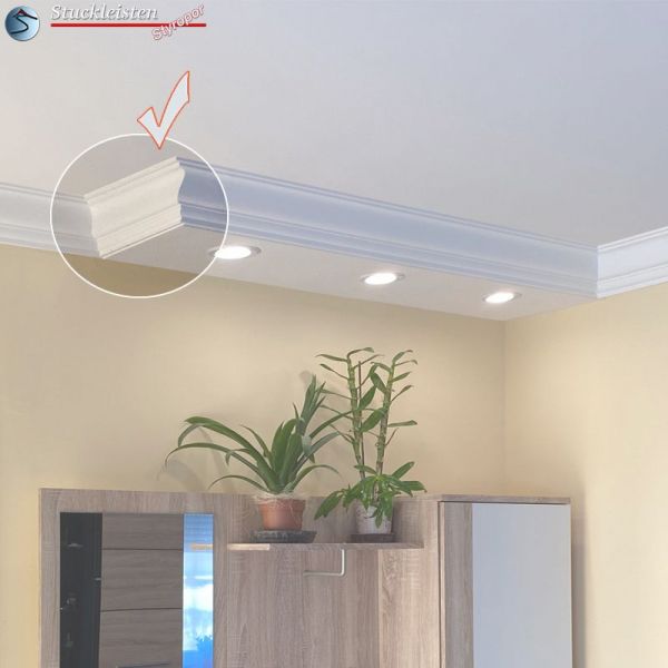 Bei der Innenraumgestaltung werden meistens alle Wände eines Raumes mit der gleichen Stuckleiste verziert. Die Stuckleiste wird in die Hohlkehle zwischen Wand und Decke geklebt, hat also zwei Klebeflächen: eine an der Wand, die andere an der Decke. Doch wie soll man verfahren, wenn man eine Gardinenstange mit der Stuckleiste verkleiden möchte? Bei den Fenstern steht meist nur die Klebefläche an der Decke zur Verfügung. Aus diesem Grund bieten wir passend zur Stuckleiste Düren 21 die Vorhangleiste Düren 21 an. Die Vorhangleiste zur Stuckleiste Düren 21 verfügt über eine breitere obere Klebefläche. So kann die Profilleiste trotz nur einer zur Verfügung stehenden Klebefläche stabil fixiert werden. Natürlich sind Innen- und Außenecken auch zur Vorhangleiste als vorgefertigte Stuckelemente erhältlich.