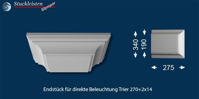 Endstück: Mit diesem Endstück können Sie das U-förmige Stuckprofil für direkte Beleuchtung Trier 190+2x14 formschön und ästhetisch abschließen. Überlassen Sie die komplizierten Gehrungsschnitte uns und ersparen Sie sich auch mit der Verwendung des Endstücks zeitraubende Bastelei. Das Endstück brauchen Sie nur einfach mit Styroporkleber an das Stuckprofil anzufügen – fertig!