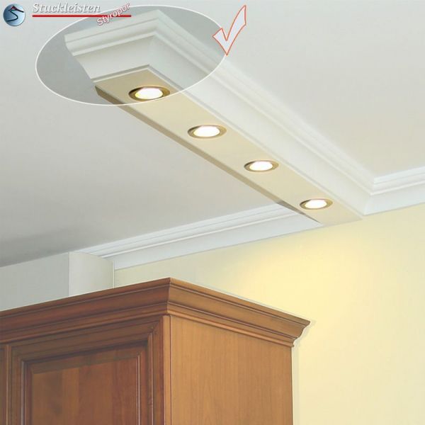 Das Stuckprofil Trier 190+14 ist ein L-Profil, das den Einbau von LED Spots entlang der Wand ermöglicht. Eine Wandbeleuchtung mit Styroporleisten und LEDs ist eine hervorragende Lösung zur Beleuchtung eines Schreibtischs oder der Arbeitsfläche in der Küche.