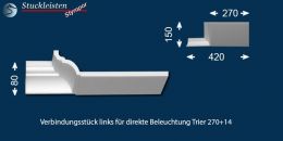 Rechtes und linkes Verbindungsstück: Falls eine Wandseite im Raum mit der klassischen Deckenleiste Trier 14 und die anschließende Wandseite mit dem Stuckprofil für direkte Beleuchtung Trier 270+14 verziert wird, dann sind die Verbindungsstücke ideal, um die beiden Stuckleisten in den Zimmerecken miteinander zu verbinden. An den einen Schenkel des Verbindungsstücks lässt sich die Zierleiste Trier 14 anfügen, an den anderen Schenkel das Stuckprofil Trier 270+14.