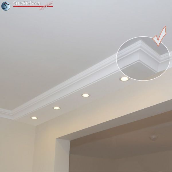 Bei der Innenraumgestaltung werden meistens alle Wände eines Raumes mit der gleichen Stuckleiste verziert. Die Stuckleiste wird in die Hohlkehle zwischen Wand und Decke geklebt, hat also zwei Klebeflächen: eine an der Wand, die andere an der Decke. Doch wie soll man verfahren, wenn man eine Gardinenstange mit der Stuckleiste verkleiden möchte? Bei den Fenstern steht meist nur die Klebefläche an der Decke zur Verfügung. Aus diesem Grund bieten wir passend zur Stuckleiste Trier 14 die Vorhangleiste Trier 14 an. Die Vorhangleiste zur Stuckleiste Trier 14 verfügt über eine breitere obere Klebefläche. So kann die Profilleiste trotz nur einer zur Verfügung stehenden Klebefläche stabil fixiert werden. Natürlich sind Innen- und Außenecken auch zur Vorhangleiste als vorgefertigte Stuckelemente erhältlich.