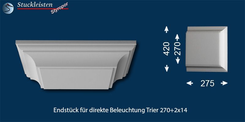 Endstück: Mit diesem Endstück können Sie das U-förmige Stuckprofil für direkte Beleuchtung Trier 270+2x14 formschön und ästhetisch abschließen. Überlassen Sie die komplizierten Gehrungsschnitte uns und ersparen Sie sich auch mit der Verwendung des Endstücks zeitraubende Bastelei. Das Endstück brauchen Sie nur einfach mit Styroporkleber an das Stuckprofil anzufügen – fertig!