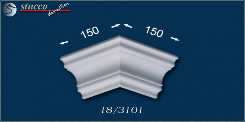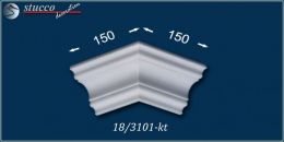 Vorgefertigtes 90°-Außeneckelement, welches das Verbergen der Gardinenschiene erleichtert. Mithilfe des äußeren Eckelements kann die Stuckverzierung als Abdeckung vor der Gardinenschiene weitergeführt werden.