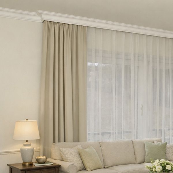Zierleiste mit identischem Muster und identischen Abmessungen zur Abdeckung der Gardinenschiene. Die klassische Hohlkehlleiste verfügt über zwei Klebeflächen: oben zur Befestigung an der Decke und hinten zur Befestigung an der Wand. Soll mit der Stuckleiste jedoch ausschließlich eine Gardinenschiene verdeckt werden, steht nur eine Klebefläche – die Decke – zur Verfügung. Für diesen Zweck wurde die Gardinenkasten-Zierleiste entwickelt. Ihre Maße und ihr Design entsprechen der gleichnamigen Hohlkehlleiste, lediglich die obere Klebefläche wurde vergrößert, sodass eine stabile Befestigung an der Decke gewährleistet ist.