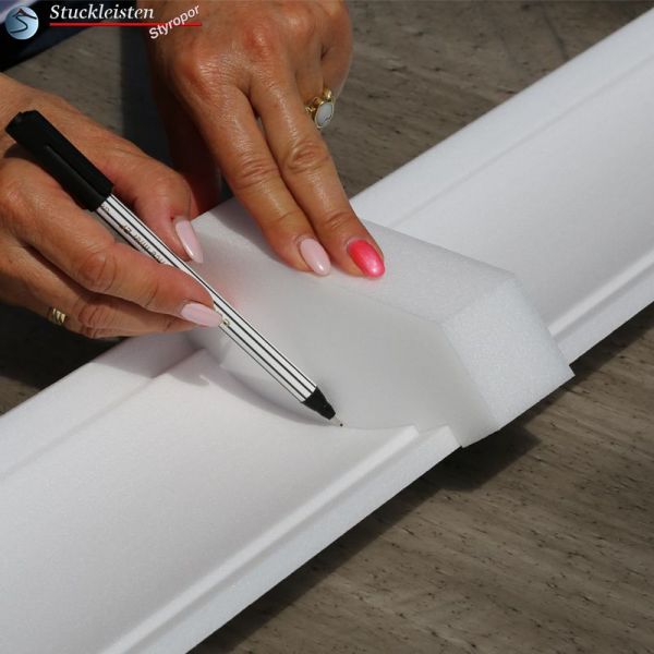 Messen Sie den Abstand zwischen den Eckelementen ab und bei Bedarf kürzen Sie die 2 Meter lange Stuckleiste. Bitte messen Sie lieber zweimal, als einmal zuwenig, bevor Sie die Stuckleisten zuschneiden. Zum Anzeichnen der Schnittlinie empfehlen wir Ihnen die Markierschablone auf die Leiste zu legen und dann z.B. mit einem Filzstift die Schnittlinie zu markieren, damit der Schnitt später gerade gelingt. Mit einem scharfen Cuttermesser können Sie die Stuckleiste neben der Markierschablone einfach und genau auf die gewünschte Länge zuschneiden.