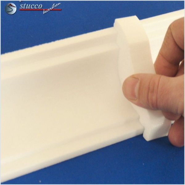 Jetzt wird der überschüssige Kleber entfernt, der beim Andrücken der Stuckelemente aus den Stoßfugen herausgequollen ist. Hierzu eignet sich entweder ein Spachtel oder - noch einfacher - unsere Negativform, die wir für jede Stuckleiste anbieten. Das Negativprofil hat den Vorteil, dass Sie mit einer Handbewegung den Kleber entfernen und gleichzeitig das Stuckmuster über die gesamte Leistenbreite nachformen.