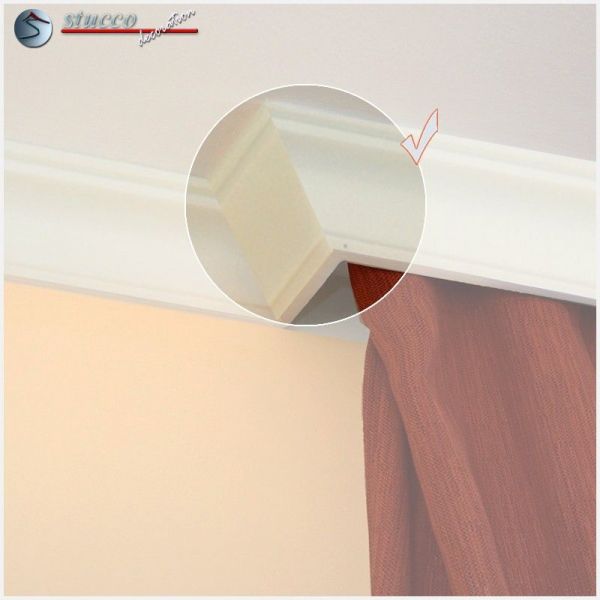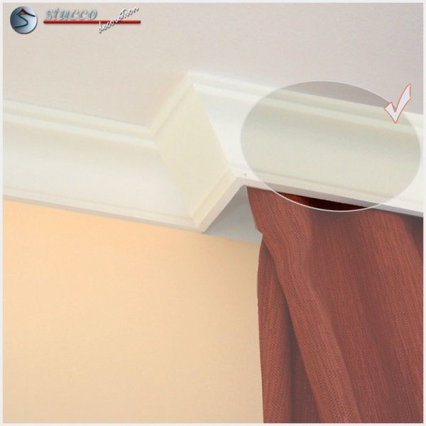 Wollen Sie bei den Stuckarbeiten die Gardinenschienen verbergen, treffen Sie auf das Problem, dass Sie hier nur eine Klebefläche - die an der Decke - nutzen können, um die Stuckprofile und Stuckelemente zu befestigen. Zur Lösung dieses Problems haben wir spezielle Stuckprofile und Stuckelemente als Vorhangleisten zur Styropor Leiste London 11 entwickelt. So wird Ihnen die Verkleidung der Gardinenschiene zeitsparend und professionell gelingen.