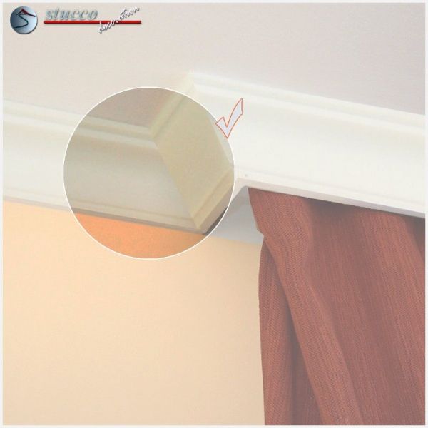 Die Styropor Vorhangleiste zum Verkleiden der Gardinenschienen wird vor den Gardinenführungen an die Decke geklebt. Lassen Sie dabei so viel Platz zwischen der Kunststoff Gardinenschiene und der Zierleiste, dass Sie die Gardinen und Vorhänge zum Waschen leicht abnehmen und nach dem Trocknen genauso leicht wieder anhängen können. Stuckleisten zur Verkleidung der Gardinenschine erhalten Sie mit der Länge von 2,0 m in unserem Webshop. Je nach Bedarf können Sie die Styroporleisten auch mit einem scharfen Cuttermesser und einer Gehrungslade kürzen.