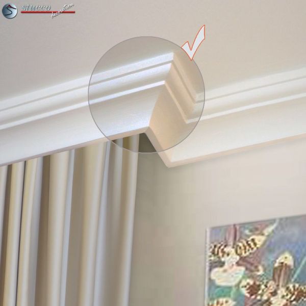 Vor der Gardinenleiste kann nur eine Klebefläche (an der Decke) genutzt werden, deswegen haben wir unsere Vorhangleisten entwickelt. Die obere Klebefläche der Vorhangleiste haben wir vergrößert, die sich dann zum Einbau vor den Gardinenschienen eignet. Zu den Vorhangleisten fertigen wir innere und äußere Eckelemente, die Sie als Weiterführung der Deckenleisten einbauen können, wie auf den Bildern gezeigt ist. Die Größe und das Stuckmuster der Eckleiste und der gleichnamigen Vorhangleiste sowie der Ergänzungselemente sind identisch, auf diese Weise kann eine einheitliche und ästhetische Stuckverzierung gestaltet werden.